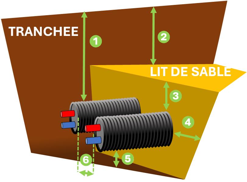 Il est impératif de toujours tenir compte des conditions de gel locales afin de déterminer la profondeur d’enfouissement des canalisations. Ces canalisations doivent systématiquement être posées sur un lit de sable afin d’éviter d’endommager la gaine de protection extérieure en PE-HD. La tranchée ne doit être complètement comblée qu’après qu'après que les canalisations aient été complètement recouvertes par du sable en prenant soin de respecter les dimensions minimales indiquées sur le schéma ci-dessous.