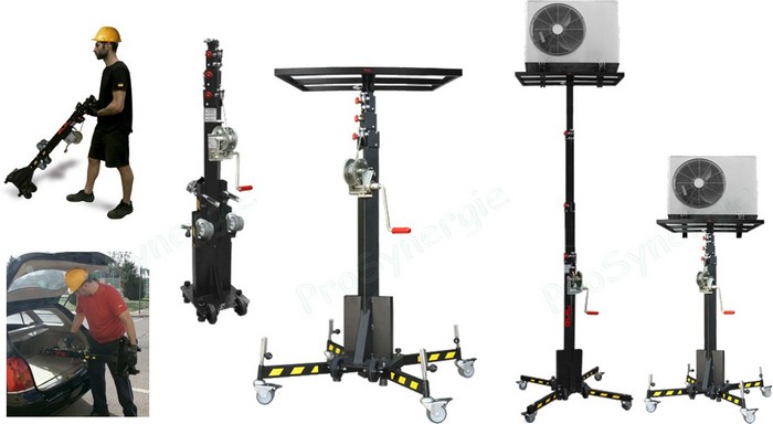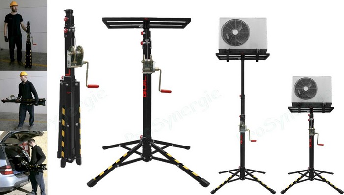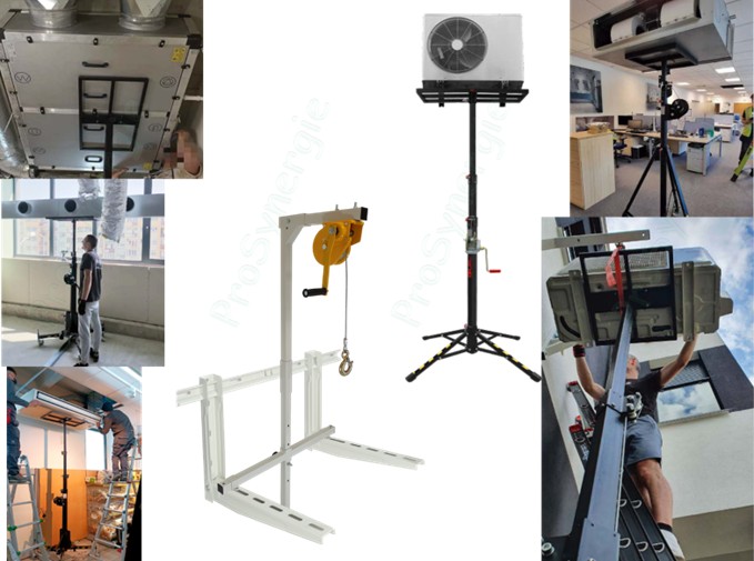 La gamme de "lève-clim" comprend un treuil et quatre élévateurs pour climatisations. Le treuil est destiné uniquement pour une pose des groupes extérieurs, tandis que les élévateurs peuvent être utilisés aussi pour une pose d’unités intérieures, ainsi que pour de multiples autres utilisations (CTA, caissons d’extraction d’air, etc…).