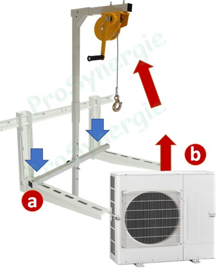 Solution pratique et innovante pour lever seul un groupe jusqu'à 150 kg. Le lève charge se fixe directement sur le châssis support de climatisation qui est fixé au mur d'un bâtiment. Une fois le groupe prépositionné sur le châssis, on peut enlever le lève charge facilement. Longueur du câble : 15m. |