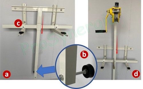 a : Pose des bras sur le support b : Tampon mural pour réglage de l’aplomb c : Fixation des bras sur le support avec vis et écrous fournis d : montage de la potence avec le treuil |