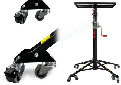 Pieds détachables maintenus en place par des goupilles magnétiques (pour éviter les pertes). Conçus pour le positionnement de la charge très près des murs. A section rectangulaire pour une plus grande résistance. Roues pivotantes avec freins et vérins de nivellement. L’ajustement indépendant des roues permet de s’adapter à un sol irrégulier ou autre terrain, rendant le lève clim GAL110634 parfaitement à niveau à l’aide du niveau à bulle installé sur l’élévateur.
