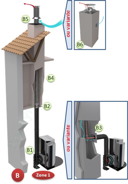 B - Conduit concentrique et raccordement au plafond sur conduit de cheminée existant